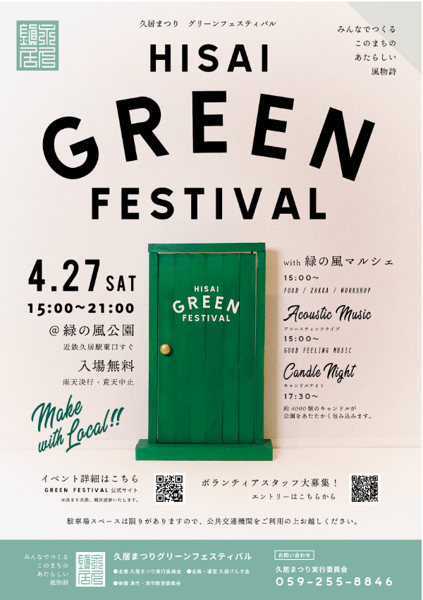 グリーンフェスティバルは年に一度、春に開催。イベントの目玉は、三重県内や久居地域の料理や雑貨、健康的な食材などを集め提供するマルシェ、三重県や久居地域のアーティストやスペシャルゲストによるアコースティックライブ、そして『一想一灯』をテーマにした、数千のキャンドルが灯る夜景が圧巻のキャンドルナイトです。
